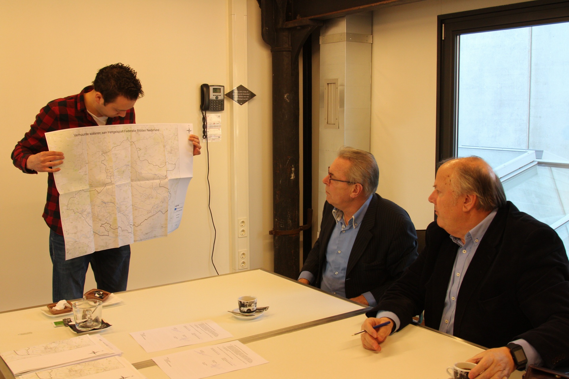 Heemraad Berend-Jan Bussink (links) van waterschap Rijn en IJssel en Sjaak Koppers (rechts) voorzitter van de Hengelsport Federatie hebben de overeenkomst getekend. Hier krijgen zij de kaart te zien met daarop alle verhuurde viswateren.