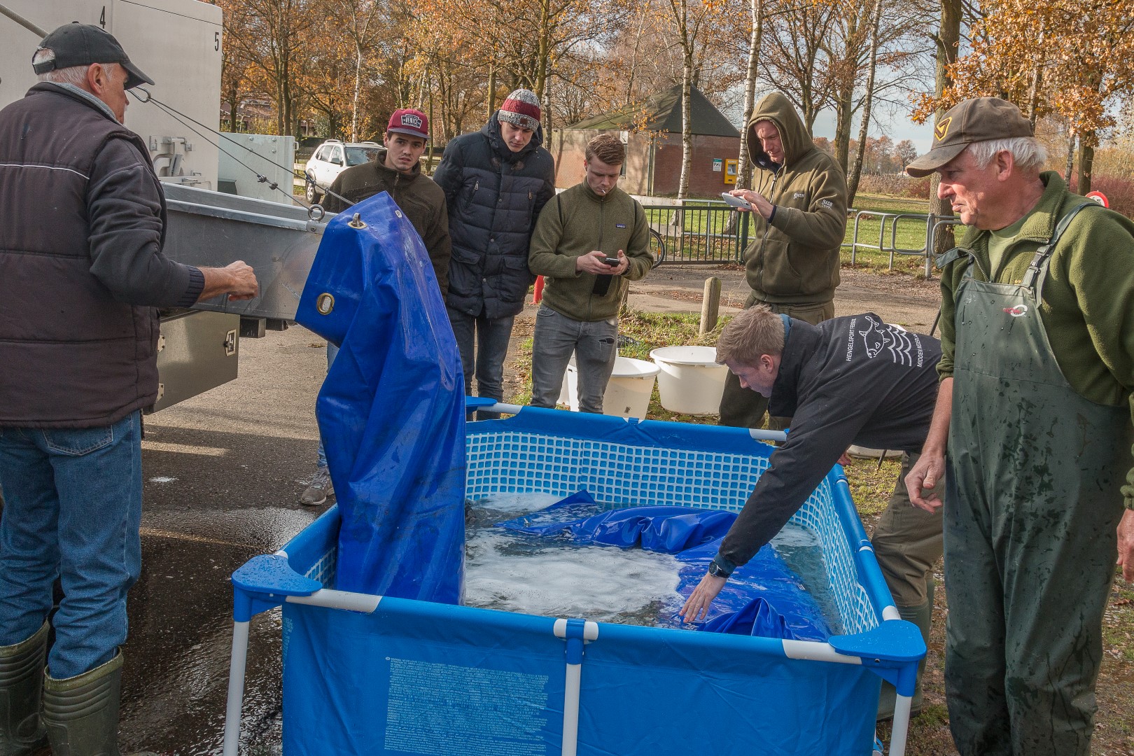 Omstreeks 12.00 uur wordt de viskweker verwacht aan de Bruggenweg in Doetinchem. Alle karpers worden hier verzameld in een zwembadje. Vervolgens worden alle spiegelkarpers gemeten, gewogen en gefotografeerd. Dit wordt gedaan om de karpers te kunnen volgen in hun migratiegedrag en groei. Nadat de vissen zijn gefotografeerd worden ze verdeeld over de verschillende stuwvakken in de beek. Op deze manier vindt er een gelijkmatige verdeling van de vissen plaats.