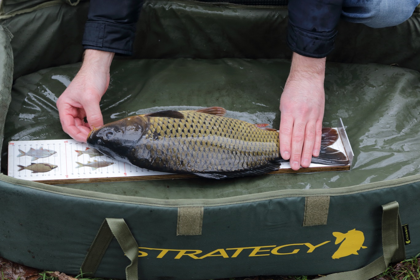 De schubkarpers werden meteen verdeeld over de bakken waarmee de vissen naar locatie werden getransporteerd en de spiegelkarpers werden in het zwembadje bewaard om vervolgens opgemeten en gefotografeerd te worden.