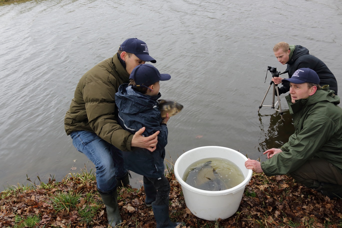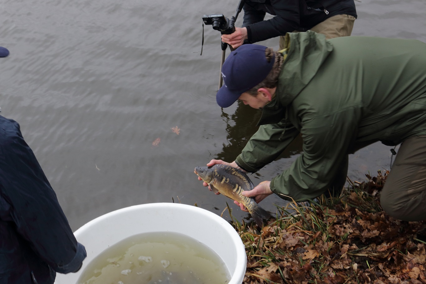 Omstreeks 12.00 uur kwam de viskeker aan op locatie om de bestelde vissen te lossen. In de keiharde wind en regen zagen enthousiaste karpersvissers hun toekomst verschijnen. Toen de vissen werden gelost kwamen er steeds meer aah's en ooh's ten gehore! Zowel de schubkarpers (52 stuks) als de spiegelkarpers (51 stuks) werden gretig in ontvangst genomen.