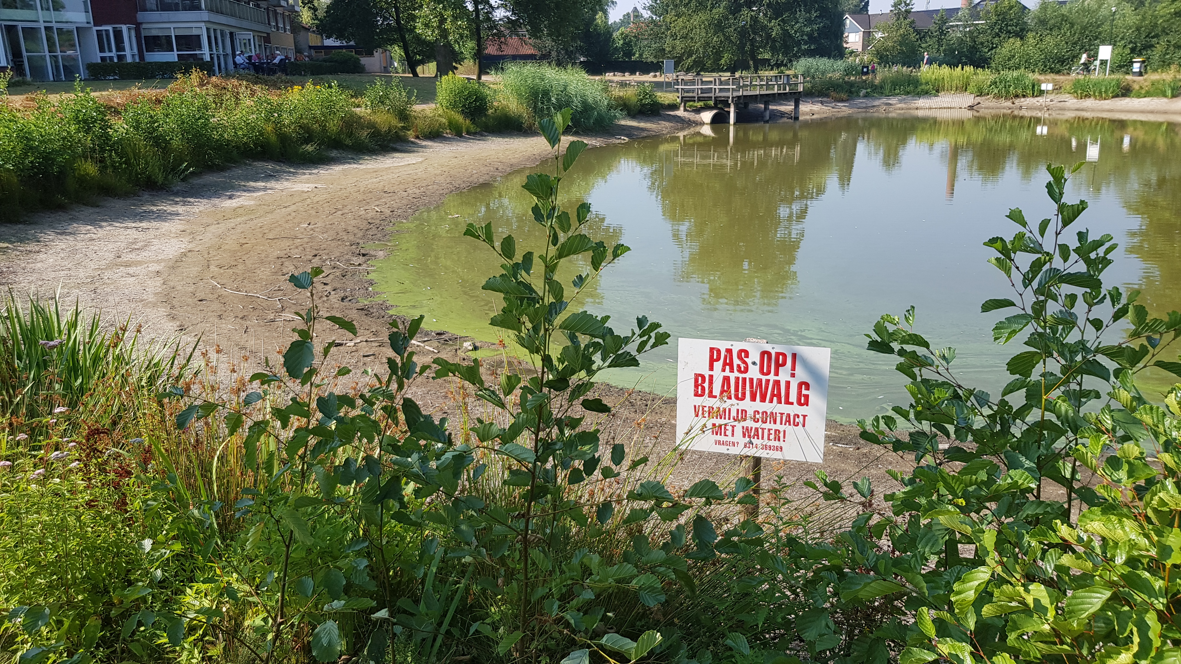 De waarschuwingsborden met op de achtergrond goed zichtbaar de gifgroene drijflaag.