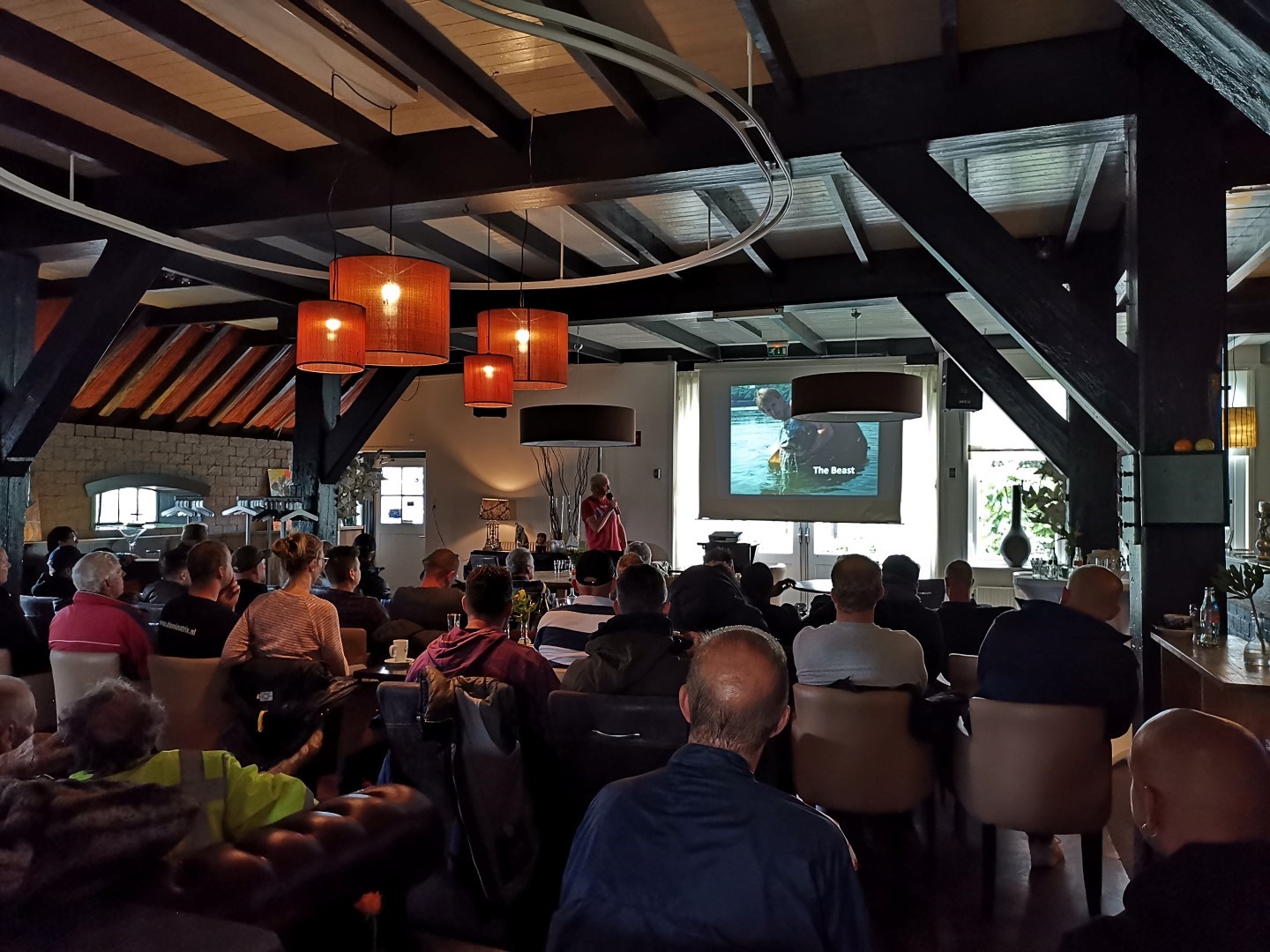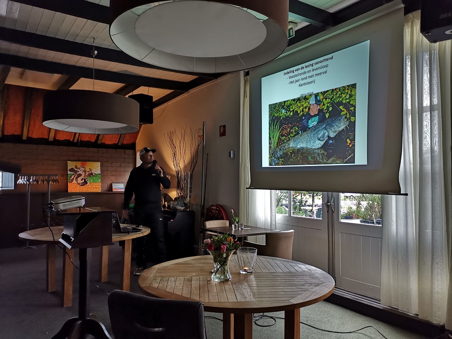 In de lezingzaal binnen in het restaurant van IJsselhoeve stonden maar liefst 3 lezingen op het programma. Roy Noom trapte af met een boeiend verhaal over statisch vissen op meerval vanaf de kant, waarbij verschillende aassoorten en materialen de revue passeerden.