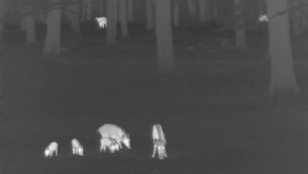 Met een warmtebeeldcamera kan je eenvoudig warme objecten zien in het donker. Onder andere het wild wat zichtbaar is op deze foto.