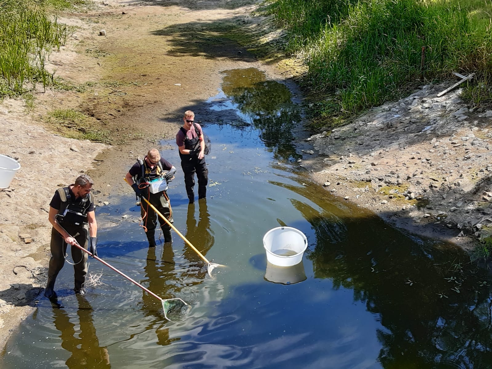 Op 23 juli vond de eerste reddingsactie plaats in de Bielheimerbeek bij Varsseveld. Een bekend stuk dat altijd als eerste droogvalt. Het was opvallend hoeveel jonge vis hier alweer aanwezig was, in 2018 en 2019 had dit deel ook helemaal droog gestaan! Er zaten alweer duizenden jonge vissen en zelfs een dikke paling! Deze vissen zijn verplaatst naar een gedeelte net beneden Varsseveld in een stuwvak welke altijd water vasthoudt.