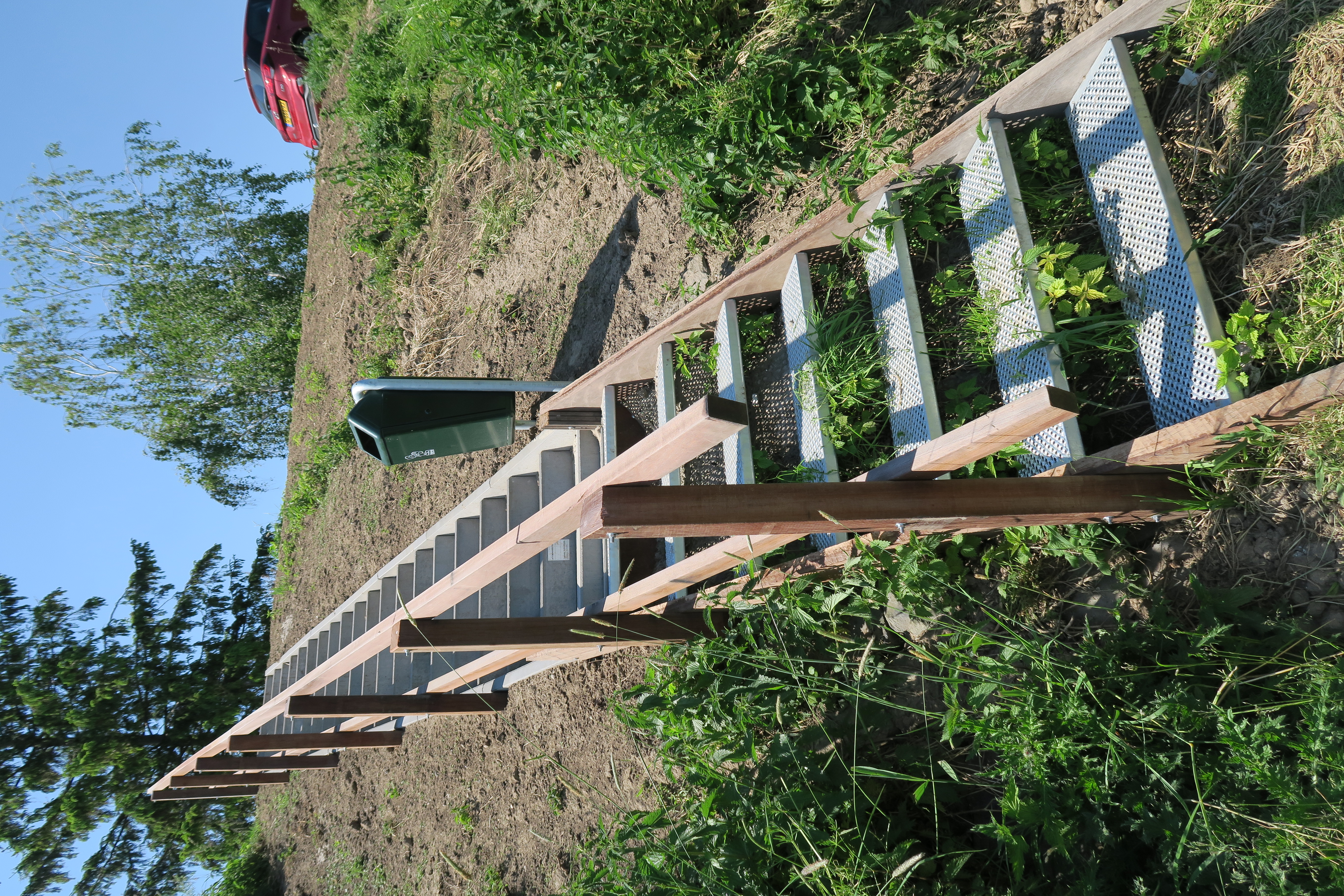 Een van de twee nieuwe trappen met een afvalbak Trapleuning aangelegd bij bestaande trappen