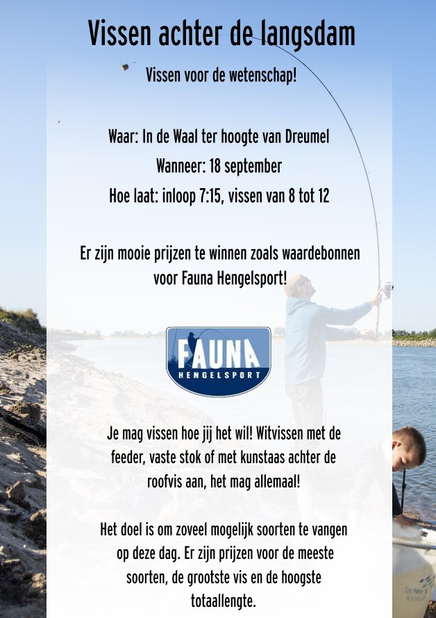 Op zaterdag 18 september a.s. kun je weer meedoen aan "vissen achter de Dam". Er wordt gevist met als doel zoveel mogelijk vis(soorten) te vangen in de nieuwe geul die parallel aan de Waal loopt bij Tiel / Dreumel. De vangsten worden doorgemeten en deze gegevens worden gebruikt voor het onderzoek naar het effect van langsdammen op o.a. de visstand.