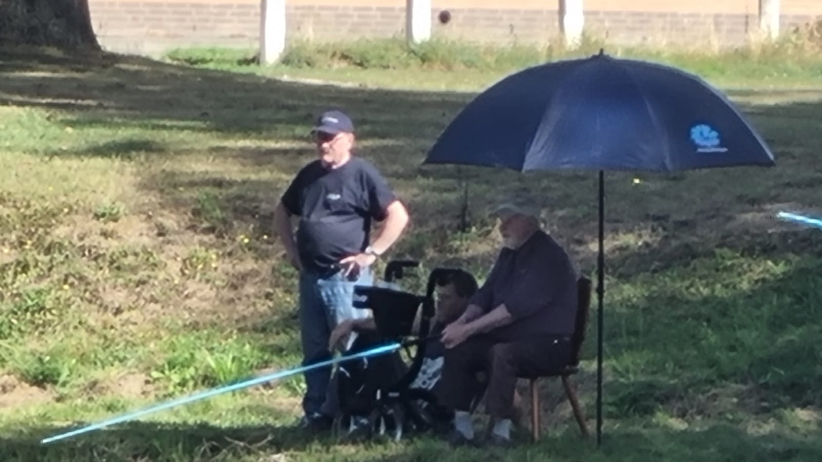 Nadat alle deelnemers een plekje hadden gevonden was het zaak om ze ook van een paraplu te voorzien, de zon kwam er al aardig door.