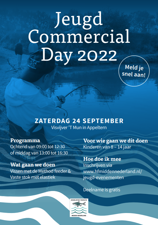 Ben jij tussen de 8 en 14 jaar en heb jij altijd al is willen vissen op een Commercial vijver? Dan is nu je kans! Op zaterdag 24 september is de Jeugd Commercial Day bij visvijver 'T Mun in Appeltern.