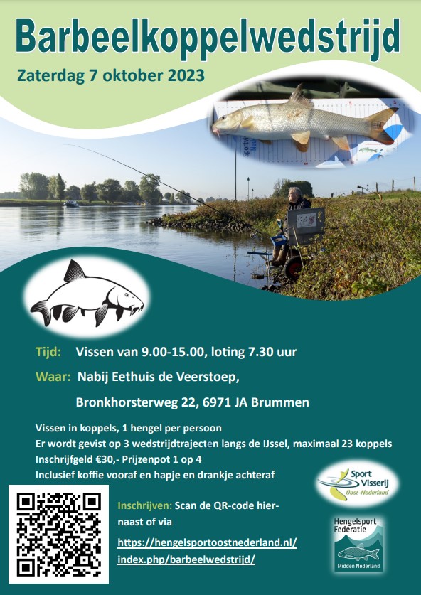 Na de geslaagde voorgaande edities staat ook dit jaar de Barbeel Koppelwedstrijd weer gepland! Op zaterdag 7 oktober a.s. vindt in de IJssel de barbeel koppelwedstrijd plaats. Bij deze koppelwedstrijd zijn mooie geldprijzen te winnen, maar de gezelligheid staat voorop. Bij deze ben je van harte uitgenodigd om mee te doen aan dit unieke evenement!