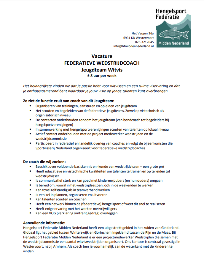 Hengelsport Federatie Midden Nederland is voor het wedstrijdseizoen 2024 opzoek naar een nieuwe Jeugdcoach wedstrijdvissen witvis. Heb jij passie en ervaring voor de wedstrijdvisserij en wil je dit graag overbrengen op de jeugd? Kijk hier dan zeker even verder.