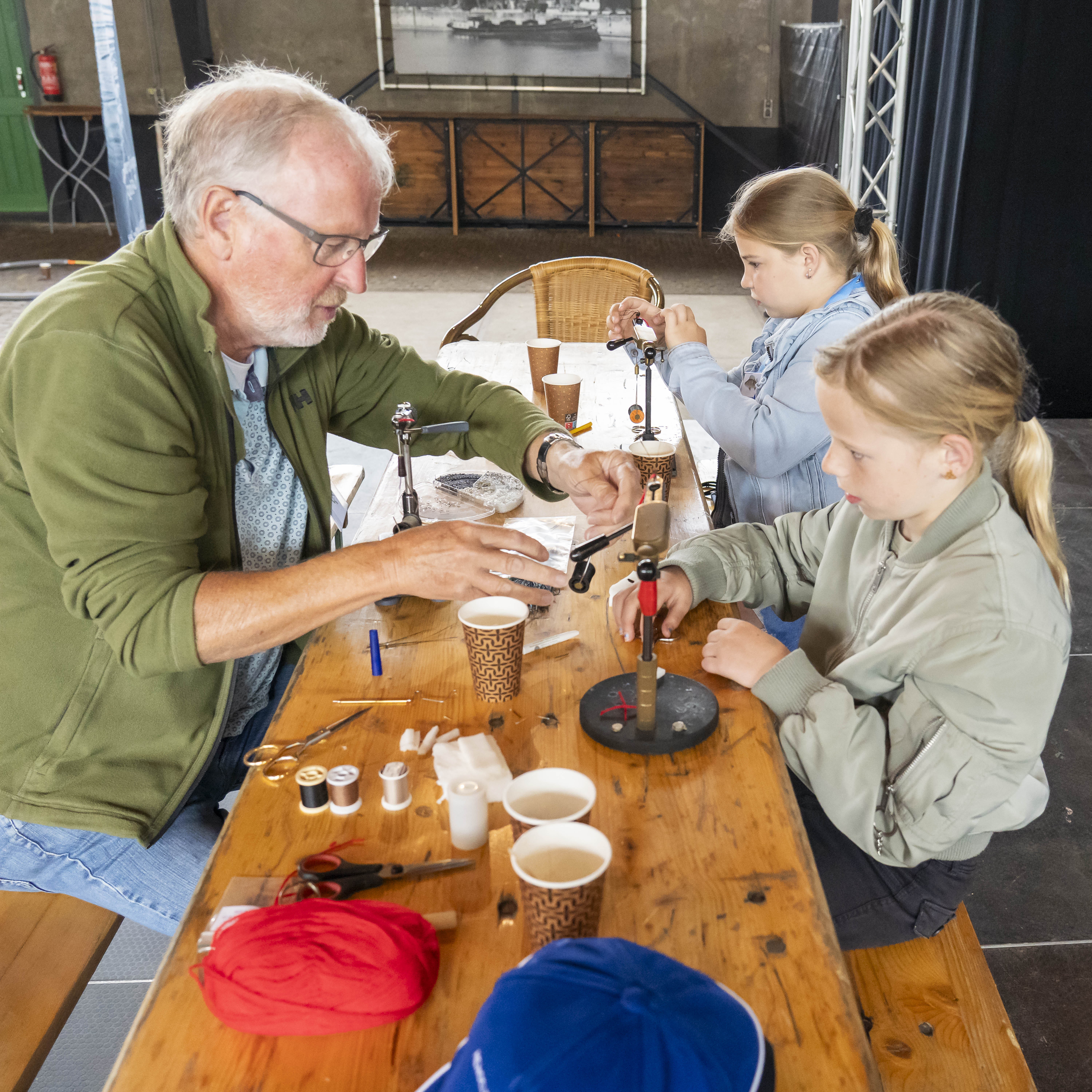 Bij het vliegvissen konden de kinderen onder begeleiding zelf een vliegje binden, leren werpen met een vliegvishengel en stond de drilsimulator klaar om de kids te laten voelen om een grote meerval of karper aan de lijn te hebben. Deze workshop werd verzorgd door Vliegvisvereniging Last Hope.