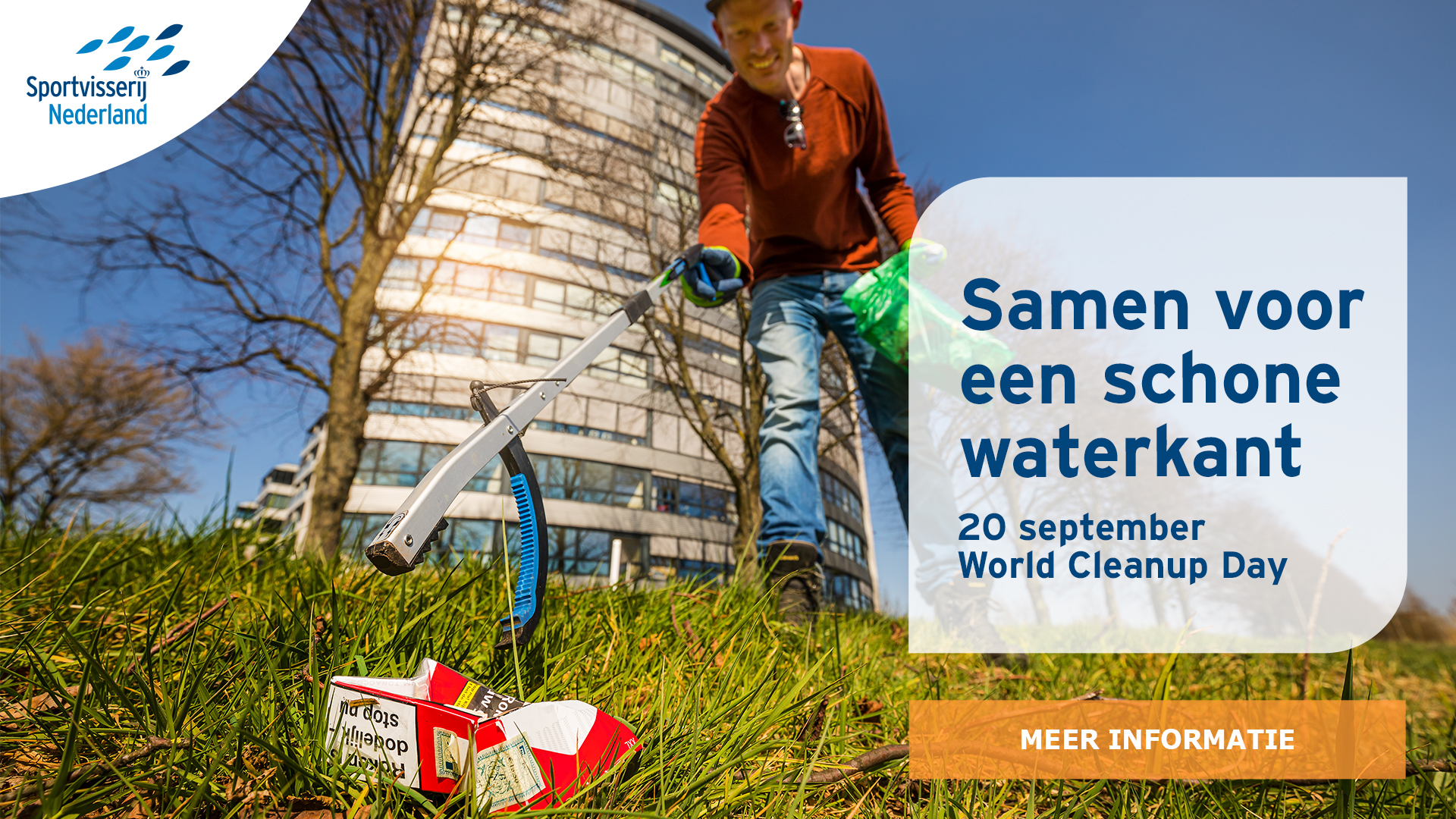Vrijdag 20 september is het World Cleanup Day. Bij deze wereldwijde opruimactie geven meer dan 200 landen de planeet een grote schoonmaakbeurt door zoveel mogelijk zwerfafval op te ruimen. Sportvisserij Nederland moedigt hengelsportverenigingen en sportvissers aan om op deze dag de waterkant extra schoon te maken.