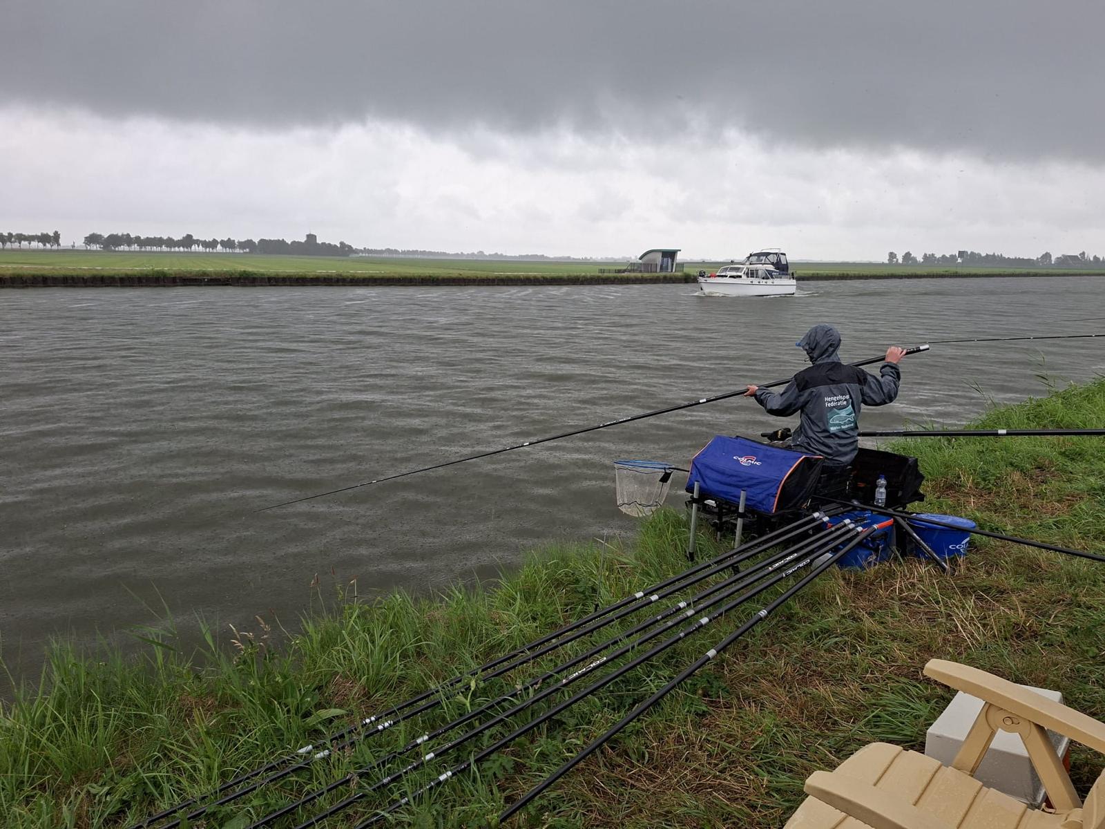 Ook in het aanvoeren zijn geen wijzigingen aangebracht en toen de toeter om 10.50 uur klonk konden de ballen te water. Op zo’n kanaal gaat er heel wat in. Er worden een heel deel ballen gegooid en daar word dan weer secuur overheen gecupt. Alles cuppen is ook geen optie want daar is de tijd te kort voor. De eerst uren gingen moeizaam maar daarna kwam het langzaam op gang, er werd beduidend meer vis gevangen dan de dag ervoor al kwam de regen tijdens de helft van de wedstrijd met bakken uit de lucht. Al waren er ook stekken waar de beten angstvallig wegbleven en we de visserij ook niet aan de praat kregen. En dan is het zaak de schade zo beperkt mogelijk te houden. Na 4 uur vissen ging de toeter en mochten de lijnen uit het water.Na de weging waren dit onze vak uitslagen: