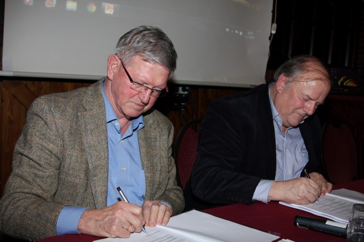 Jan Eggens (links) en Sjaak Koppers (rechts) ondertekenen het visplan.