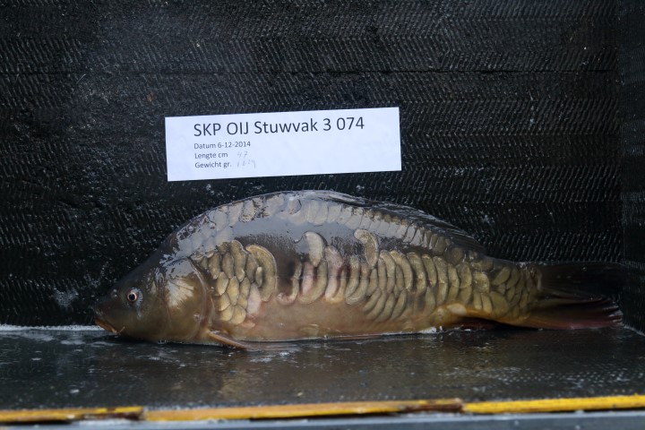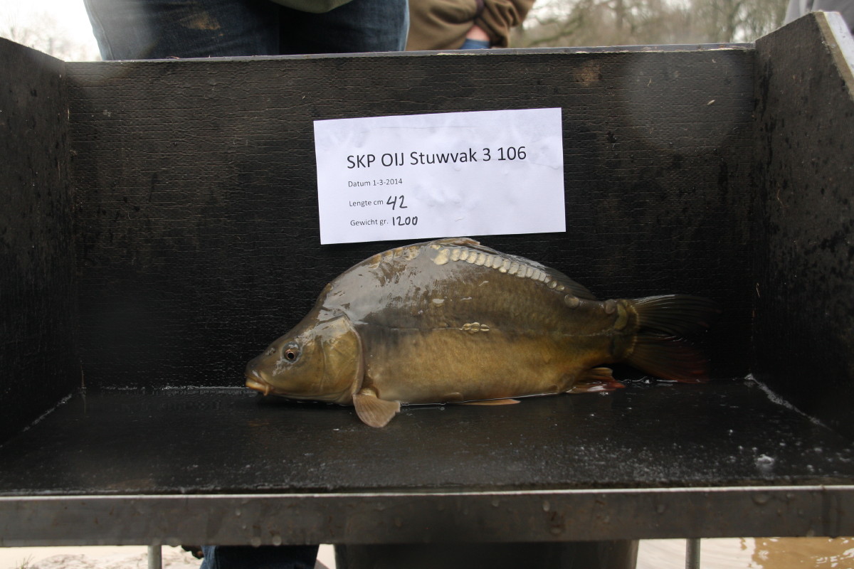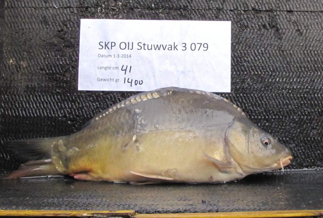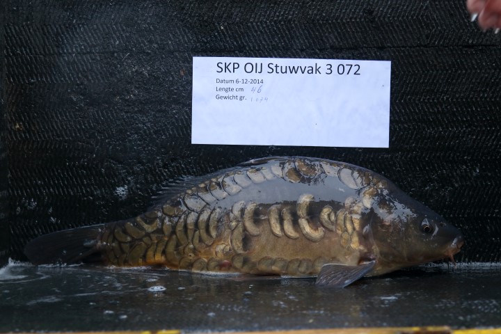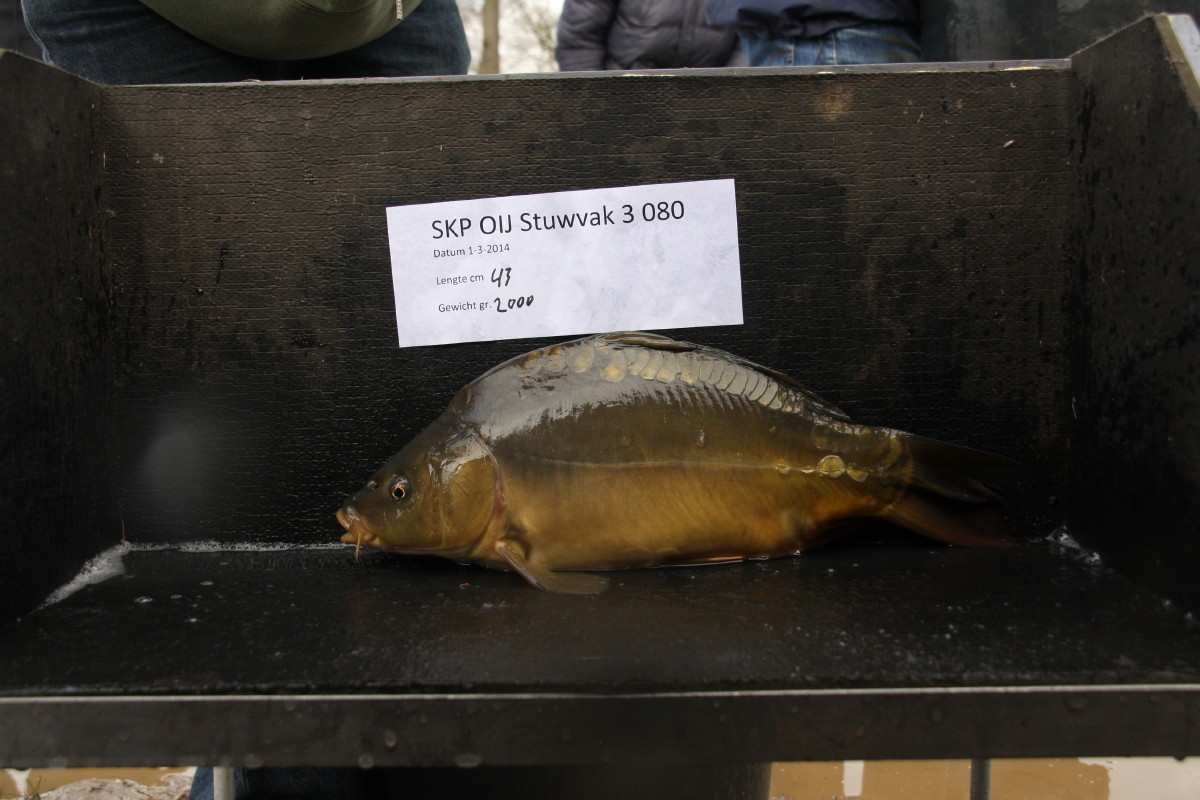 Enkele vissen die zaterdag zijn uitgezet, het unieke schubbenpatroon is hierbij goed zichtbaar. Terugmeldingen uitzetting 1 maart 2014