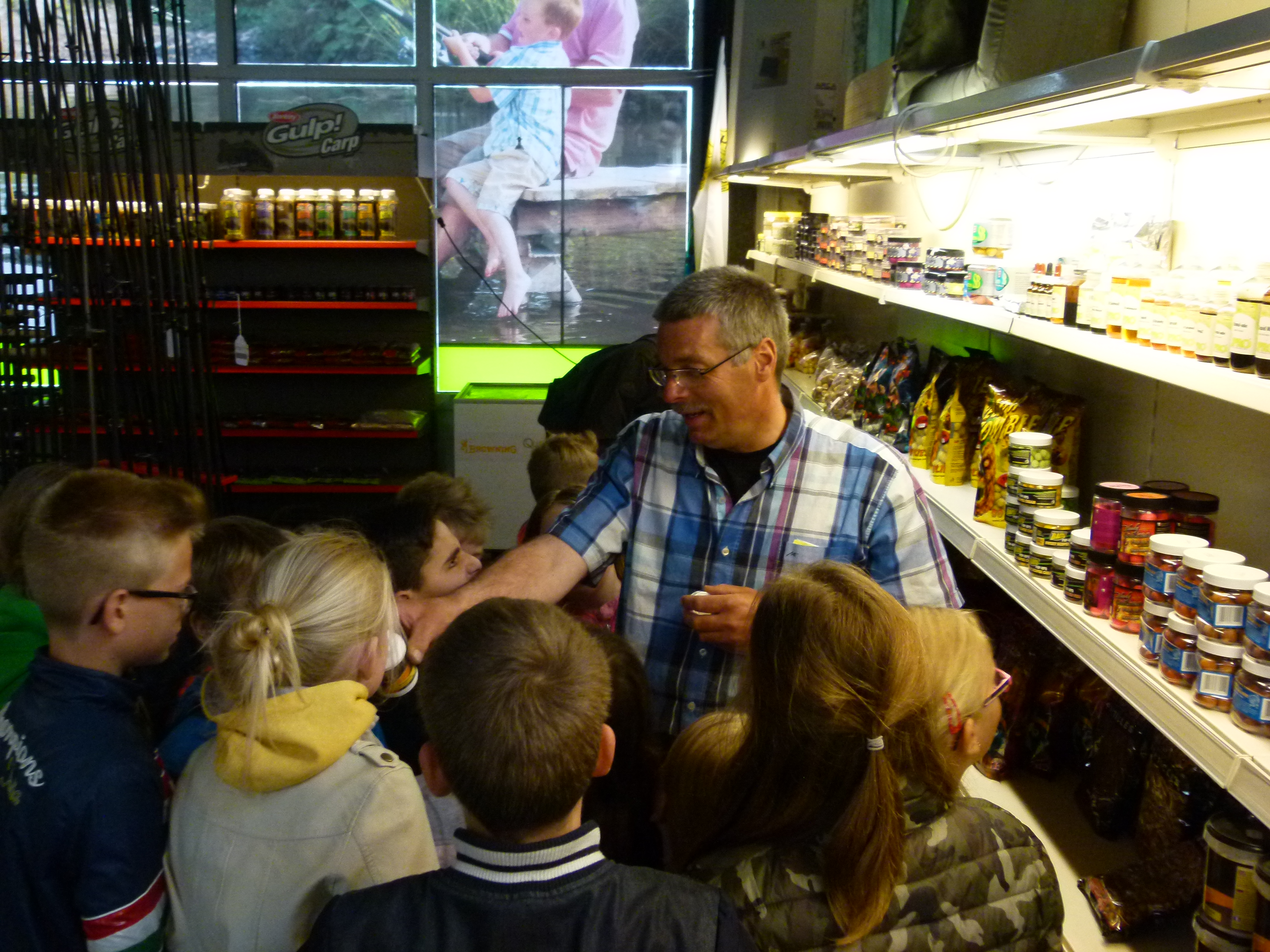 allemaal.Dat de Hengelsportzaak als locatie is gekozen voor de presentatie, is natuurlijk niet zonder reden. Aansluitend op het verhaal van Erik Mentink (voorzitter GHV) gaf de eigenaar van de winkel, Rene Bomers een rondleiding door zijn winkel. De klas was onder de indruk van wat er zoal in de winkel lag. Van boilies tot leefnetten, van pluggen tot top elastieken, het lag er allemaal.