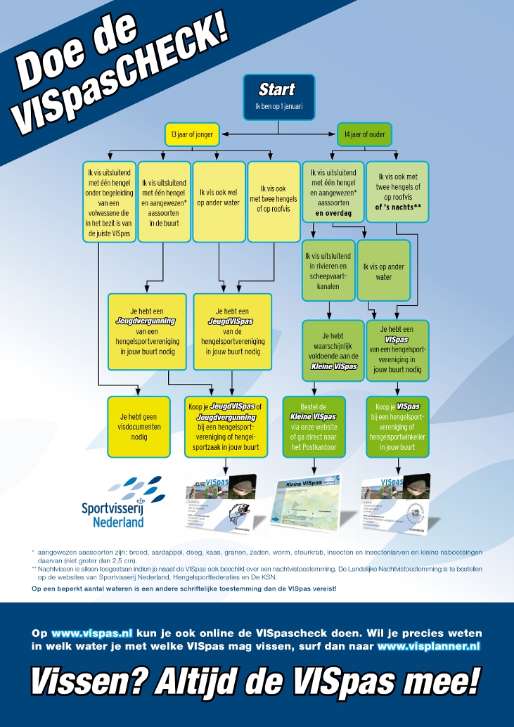 Voor de meeste vissers is de VISpas de beste keuze. De VISpas krijg je als je lid wordt van een hengelsportvereniging die is aangesloten bij Hengelsport Federatie Midden Nederland of een van de andere hengelsport federaties in Nederland. Hiermee kun je met twee hengels en alle toegestane aassoorten vissen in alle wateren die zijn ingebracht in de Gezamenlijke lijst van Nederlandse Viswateren.