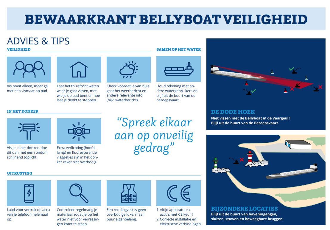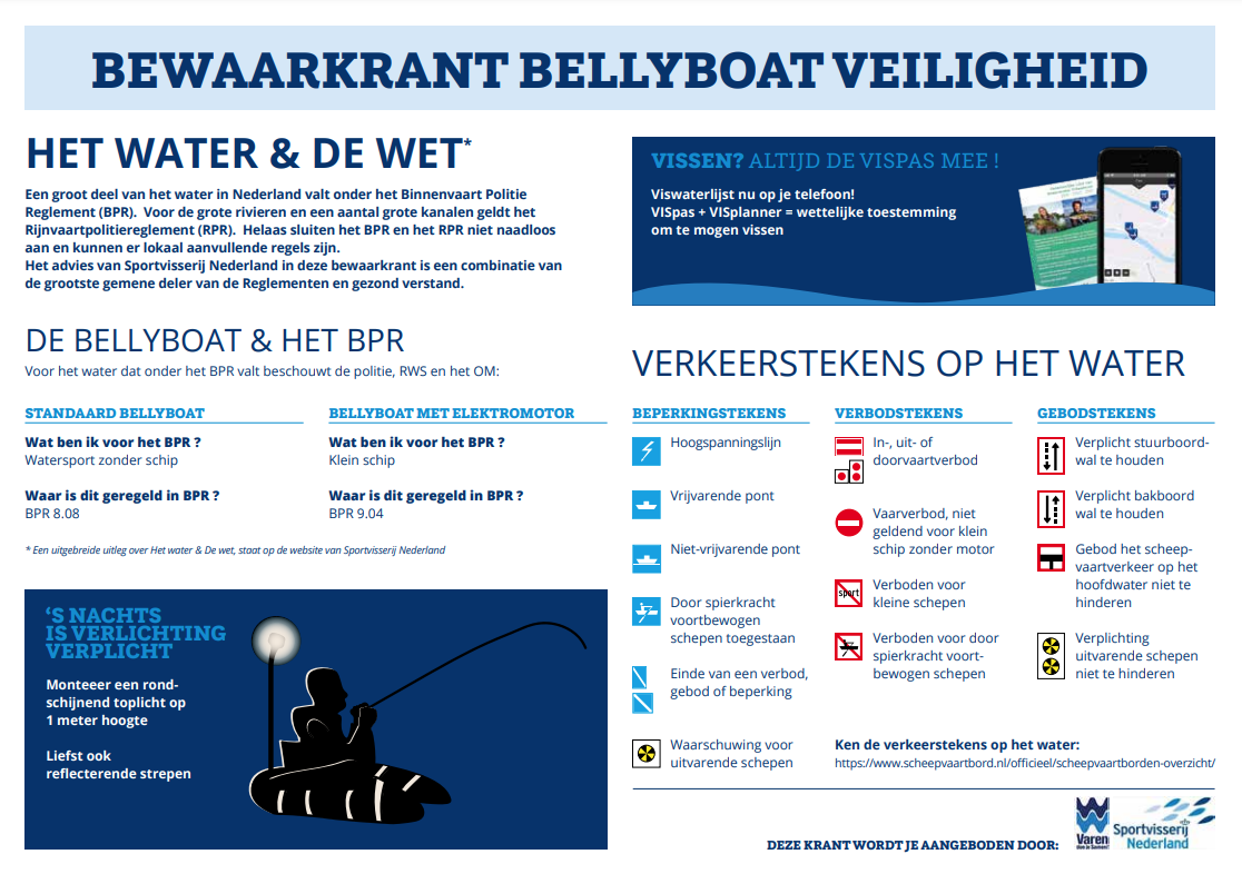 De bellyboat is de laatste jaren aan een opmars bezig op het Nederlandse water. Steeds meer sportvissers ontdekken hoe leuk het is om vanuit ‘een drijvende zetel’ te vissen. Daarbij dient de gebruiker wel een aantal belangrijke regels in acht te nemen om veilig vanuit de bellyboat te vissen.