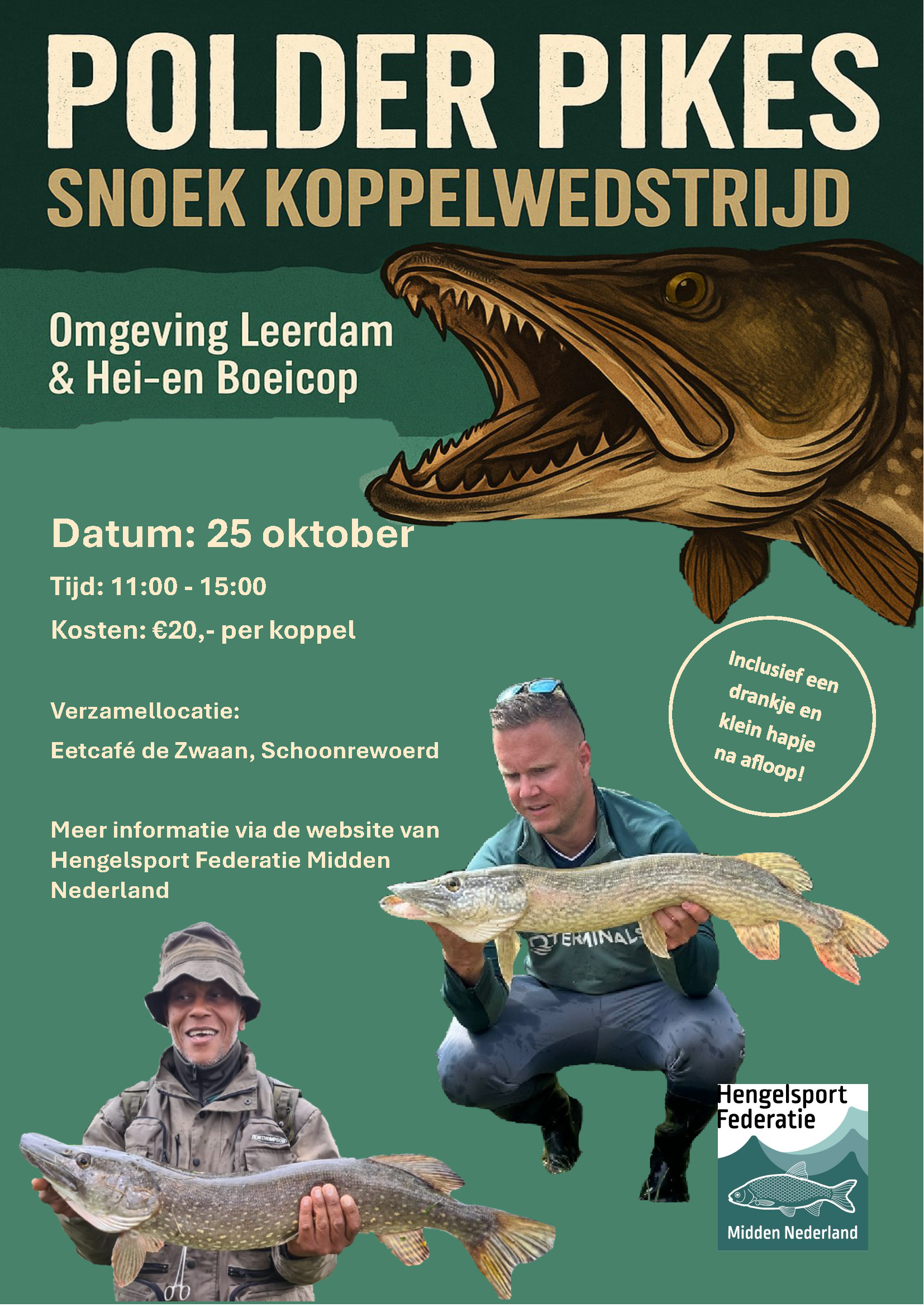 Zaterdag 25 oktober organiseert de roofviscommissie van Hengelsport Federatie Midden Nederland een snoek koppelwedstrijd genaamd 'Polder Pikes'. Deze wedstrijd vind plaats in de wateren rondom Leerdam, Hei- en Boeicop en Leerbroek. Er is plaats voor 20 koppels, vol = vol en we werken niet met een reserve lijst. De inschrijving sluit op 20 oktober 2025.